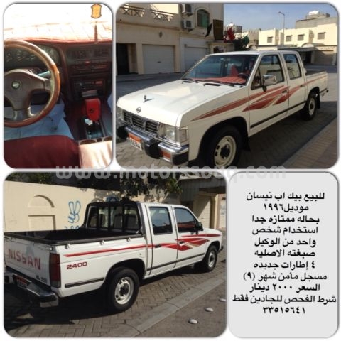 - وصف : للبيع بيك آب نيسان موديل ١٩٩٦ بحاله ممتازه جدا استخدام شخص واحد من الوكيل صبغته الاصليه ٤ اطارات جديده مع الضمان مسجل مأمن شهر ٩ السعر ٢٠٠٠ دينار شرط الفحص للجادين فقط