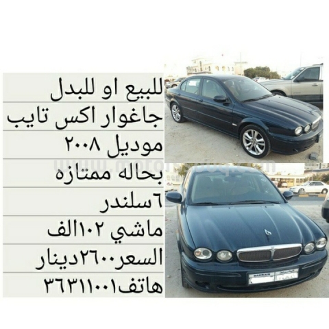 وصف :للبيع او البدل جغوار اكس تايب موديل 2008 بحالة ممتازة 6 سلندر ماشي 102 الف السعر 2600 دينار