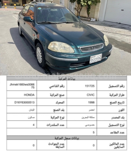 وصف :للبيع هوندا سفيك موديل: 98 بحالة ممتازة / فتحه سقف / مكيف بارد مسجل ومأمن لغاية شهر 2/2022 السعر: 550 وقابل للتفاوض الموقع:المحرق