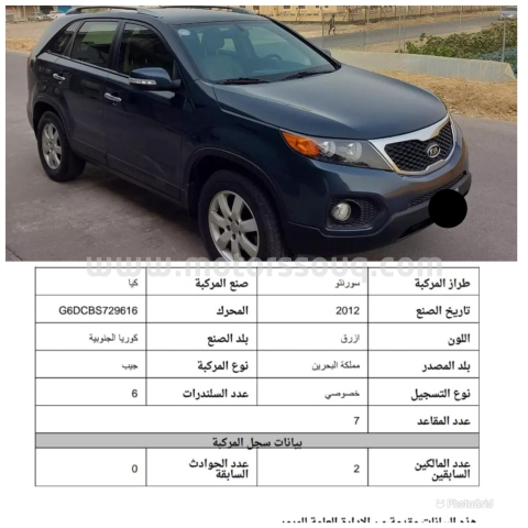 وصف :للبيع كيا سورنتو موديل :2012 ٦ سلندر ماشي : 133 ألف فقط ???? تسجيل وتأمين ١٢ / ٢٠٢٢ صيانة في الوكالة ???? بدون حوادث نهائيًا ???? السعر 3450 و قابل للتفاوض