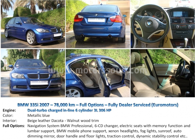 - وصف :Color: Metallic blue Interior: Beige leather Dacota - Walnut wood trim Full Options: Navigation System BMW Professional, 6-CD changer, electic seats with memory function and lumbar support, BMW mobile phone support, xenon headlights, fog lights, sunroof, auto dimming mirror, door handle and floor lights, traction control, dynamic stability control etc...